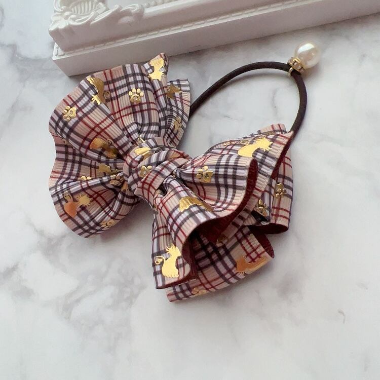 優しいベージュ&ねこちゃん♡チェック柄♡フリルたっぷりリボンのヘアゴム