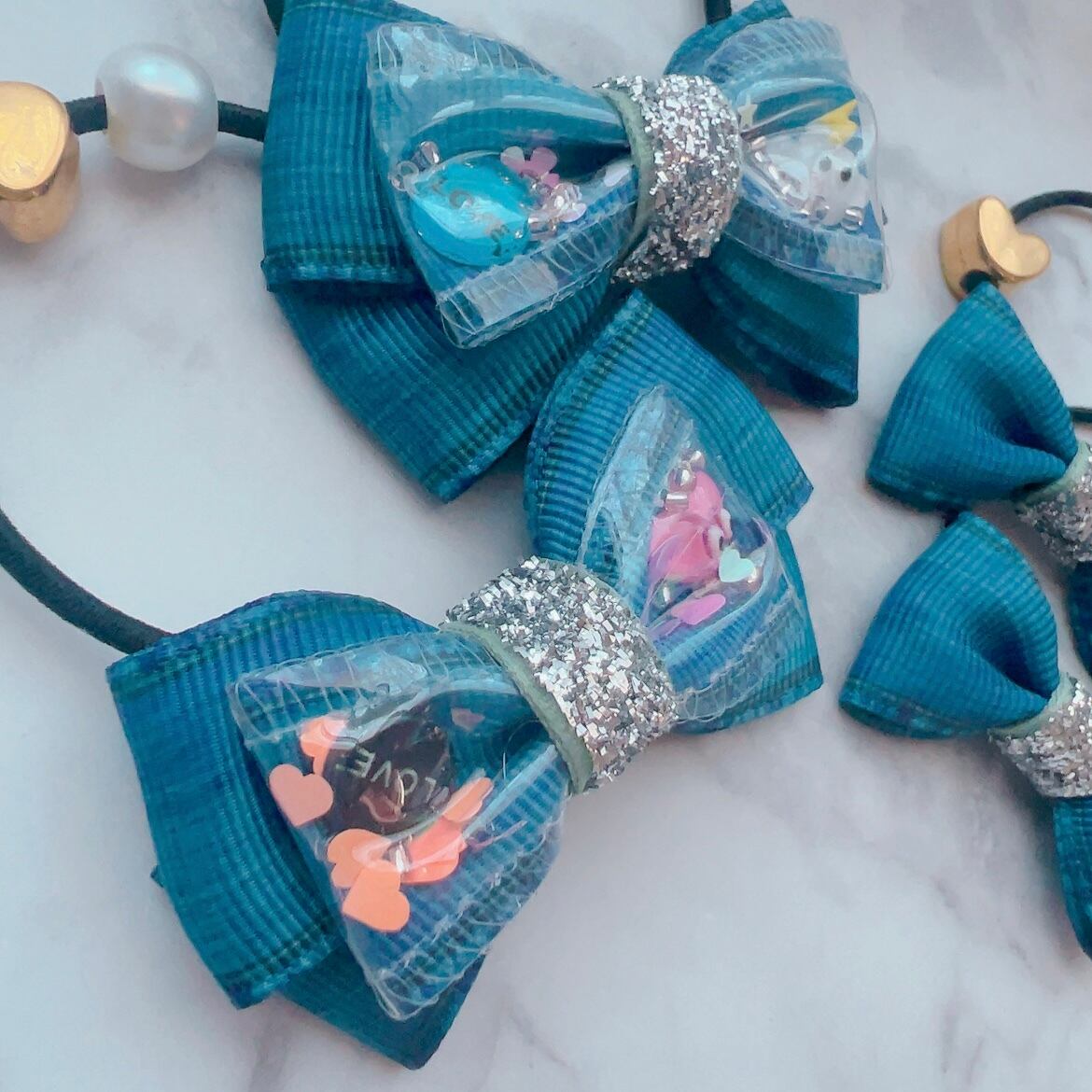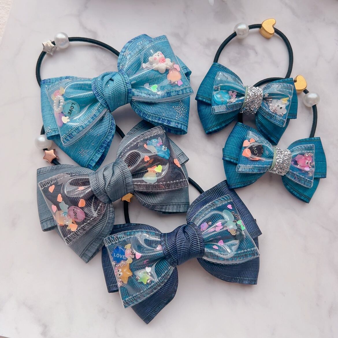 紺色デニム♡ 夢いっぱいのシャカシャカリボン ヘアゴム 4個セット