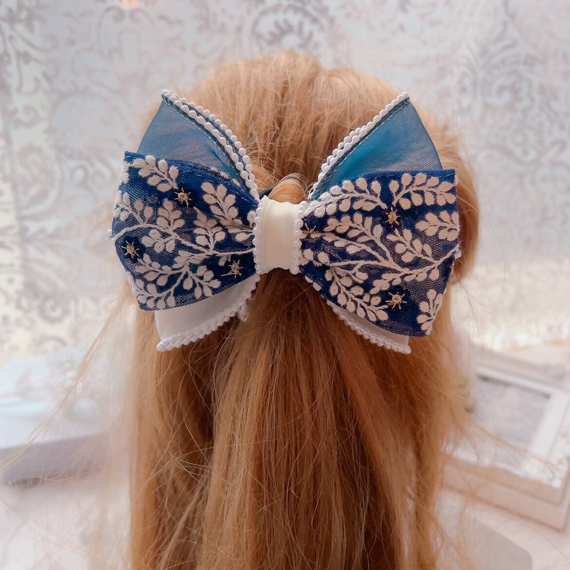 美しいインド刺繍を楽しむ♡紺色&オフホワイトのパールオーガンジーりぼん