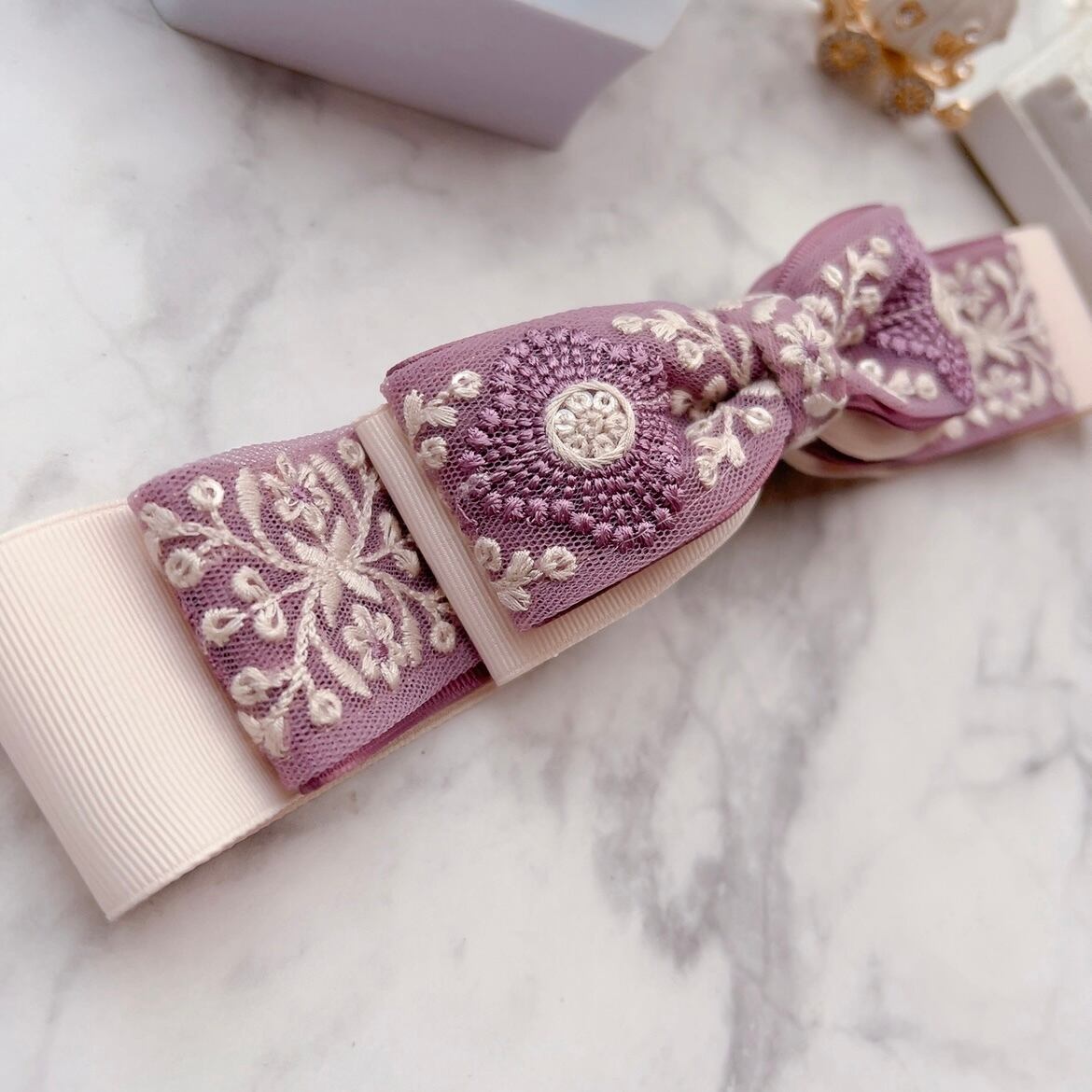 春めく♡くすみパープルとライトベージュ♡インド刺繍のたらりんループのリボン