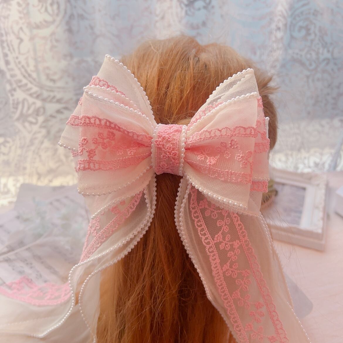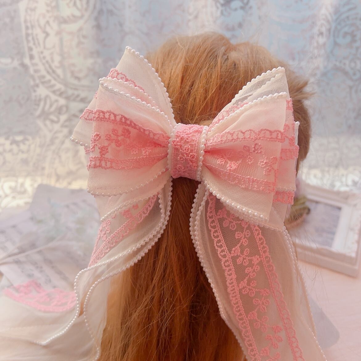 ミルキーな色合い♡オフホワイト&ピンクの刺繍レース♡パールオーガンジー大きめリボン